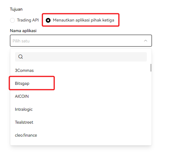 Untuk membuat kuci API Bitsgap, klik tombol [Menautkan aplikasi pihak ketiga] di bagian Tujuan dan pilih Bitsgap dari daftar nama Aplikasi.