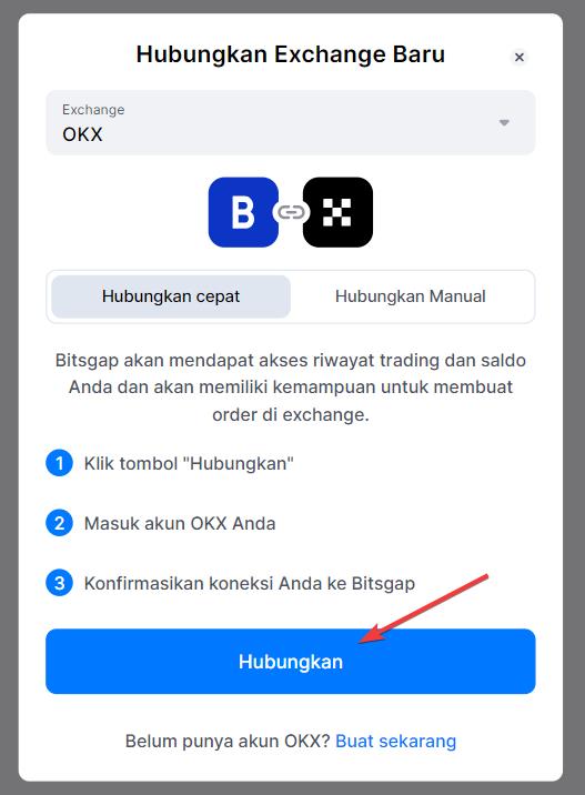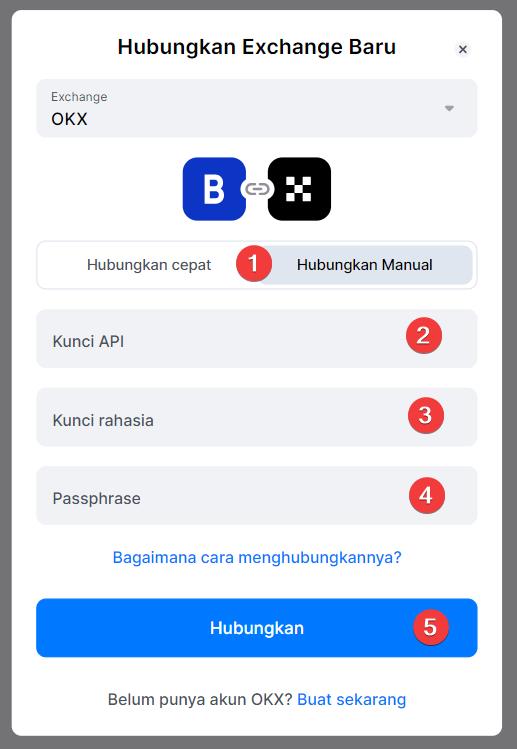 Dari jendela pop-up, pilih OKX. Di jendela Hubungkan Manual, tempel kunci API, kunci Rahasia, dan Frasa Sandi. Kemudian klik [Hubungkan].