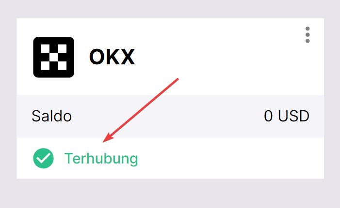 Jika semuanya sudah benar, Anda akan melihat OKX ditambahkan ke daftar exchange terhubung Anda dengan status Terhubung, dan saldo perdagangan tersedia di akun Anda.