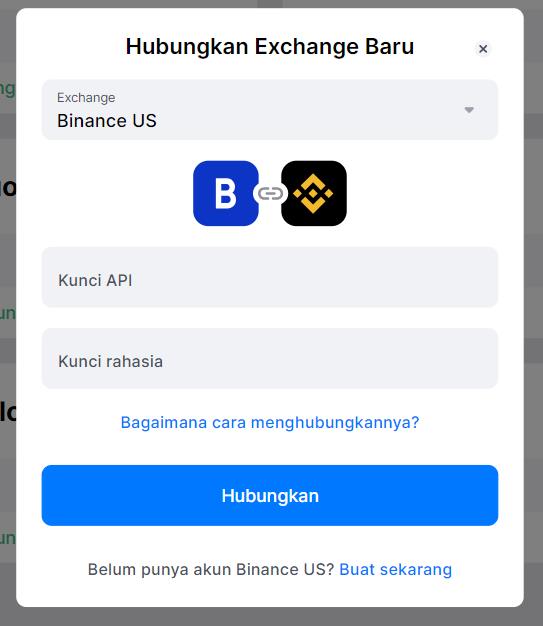 8. Pilih exchange Binance.US dan masukkan informasi API Anda