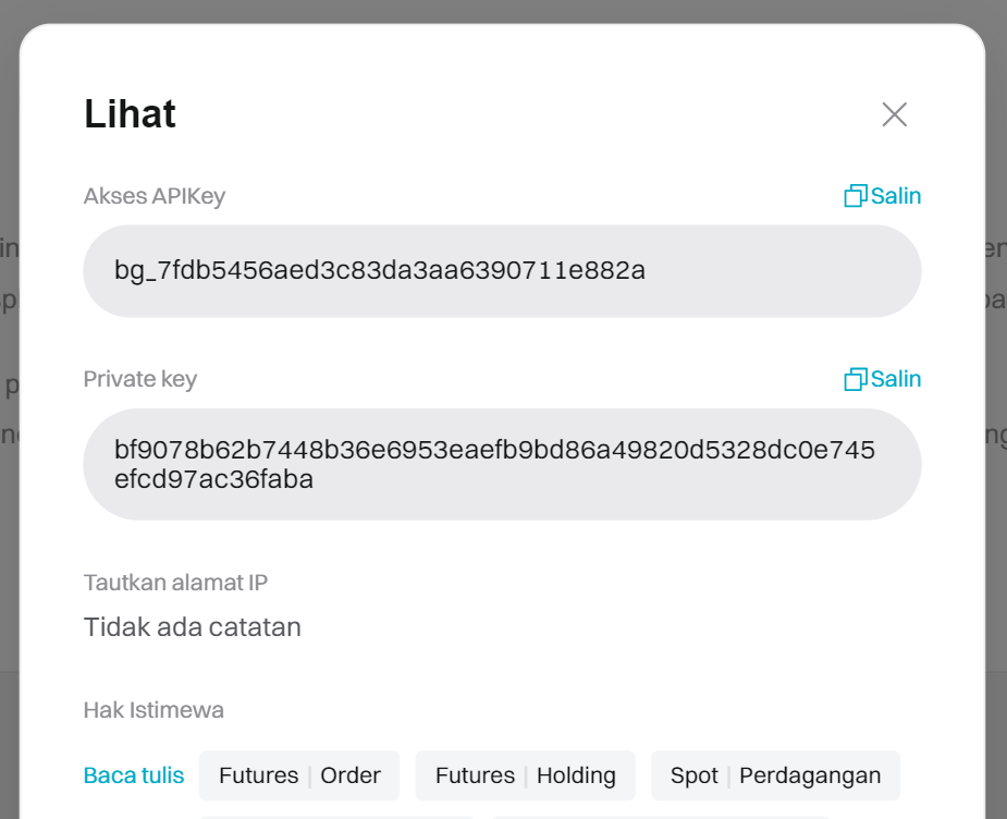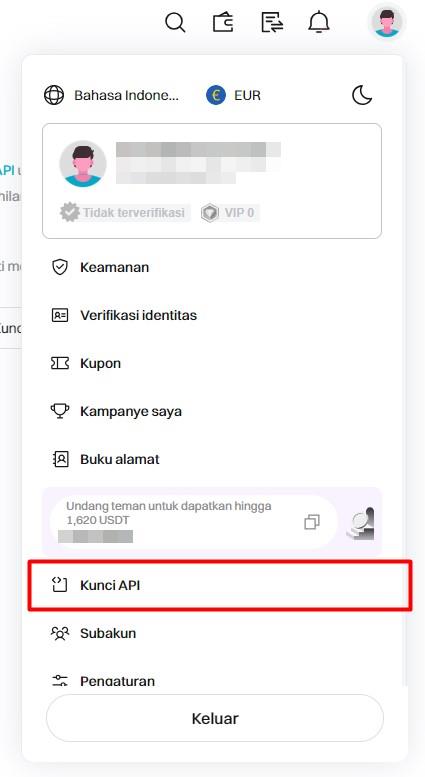 Semua operasi trading diproses melalui kunci API yang unik untuk masing-masing pengguna. Kunci API merupakan metode yang aman dan dapat diandalkan untuk menggunakan platform ini karena tidak memberikan akses ke data pribadi Anda dan mencegah pengelolaan dana (penarikan & deposit).