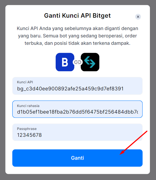 Masukkan kunci API, kunci Rahasia, dan Passphrase Anda. Setelah itu, klik tombol [Ganti] untuk memperbarui pengaturan kunci API Anda.