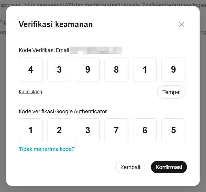 Masukkan kode Verifikasi Email atau kode 2FA, kemudian klik [Konfirmasi].