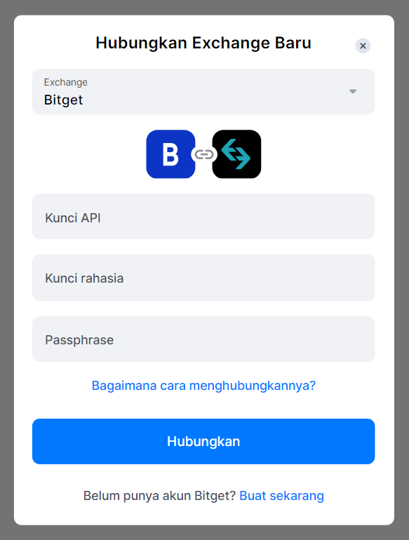 Jika semua langkah sudah benar, Anda akan melihat Bitget di daftar Excahange dengan status "Terhubung" dan saldo trading tersedia di akun Anda.