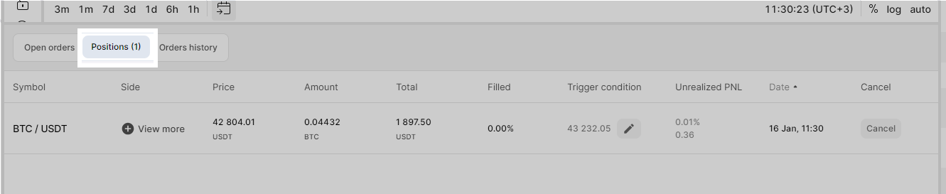 Ketika order tereksekusi, Anda akan menerima notifikasi di platform. Order akan berpindah dari tab Open Orders ke Positions.