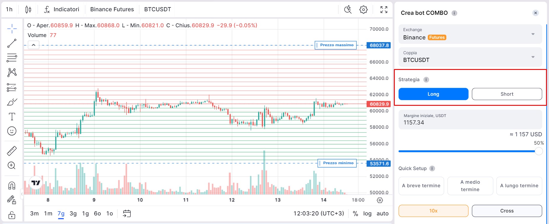 Rispetto ai bot spot, il COMBO Bot può generare rendimenti molto più rapidamente. Tuttavia, è fondamentale ricordare che il trading di futures comporta maggiori rischi. Il COMBO Bot combina le strategie Grid e DCA e genera profitti esclusivamente in USDT. Il bot può seguire il trend in entrambe le direzioni (Short e Long).