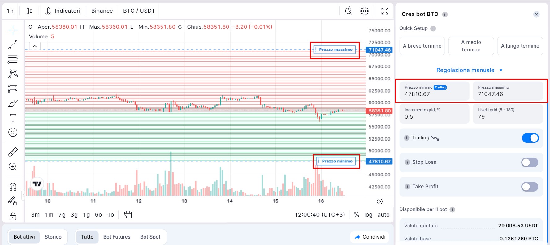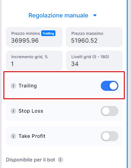 Nota: la modifica dell'intervallo di prezzo influisce sulla percentuale del passo della griglia, mantenendo fissi i livelli della griglia. Se modifichi uno dei parametri, l'impostazione modificata per ultima rimarrà fissa, mentre l'altra si adatterà di conseguenza.
