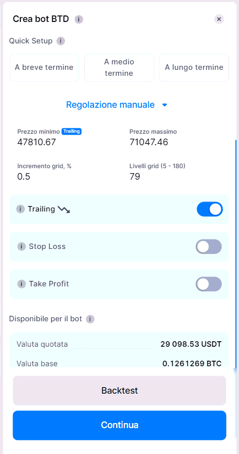 Il bot Buy-The-Dip (BTD) di Bitsgap offre opzioni di personalizzazione versatili, permettendoti di adattare la tua strategia di trading alle condizioni di mercato.