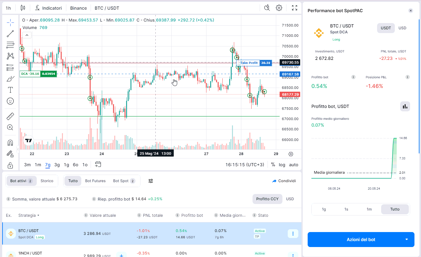 Il bot eseguirà la transazione di averaging, e vedrai la dimensione della posizione aggiornata e il nuovo prezzo DCA nella cronologia del bot con lo stato “Manual avg”. Le modifiche verranno anche visualizzate sul grafico.