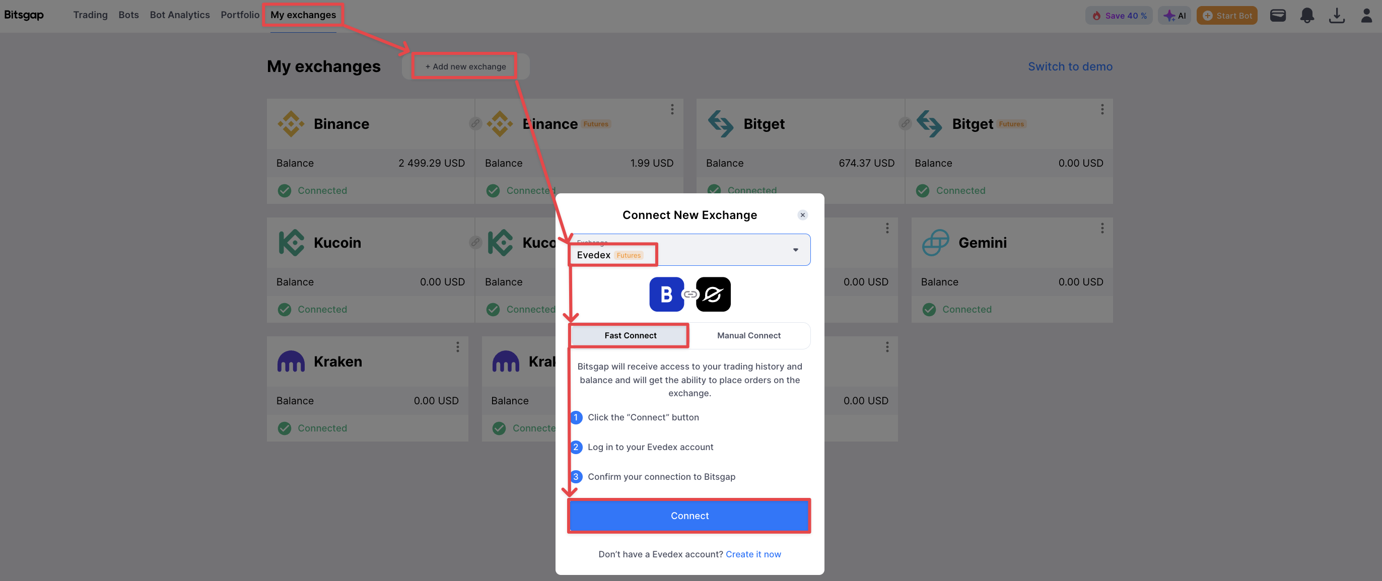 Fast Connect ti consente di collegare Evedex a Bitsgap senza creare o gestire manualmente le chiavi API.