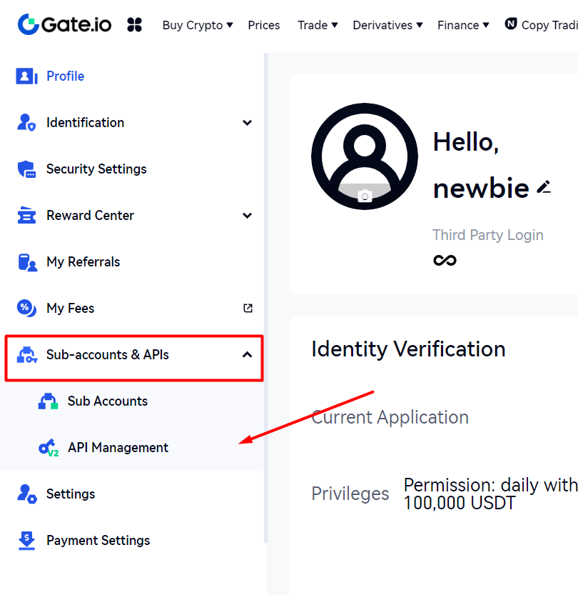 Sul lato sinistro vedrai la scheda Sub-accounts and APIs"(Conti secondari e API). Clicca sopra e vai alla pagina "Management API" (Gestione API).