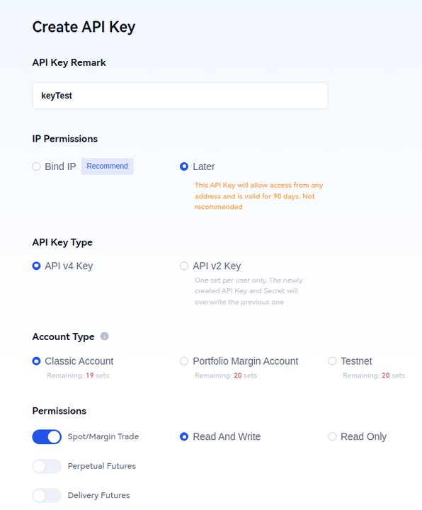 - Autorizzazione: Spot/Margin Trade, Read and Write