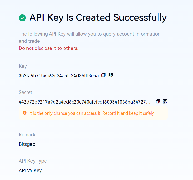 Ora la tua chiave di trading Gate è stata creata con successo ed è pronta per essere connessa alla nostra piattaforma! Copia la tua chiave API e la chiave segreta in un luogo sicuro prima di aggiungerle a Bitsgap.
