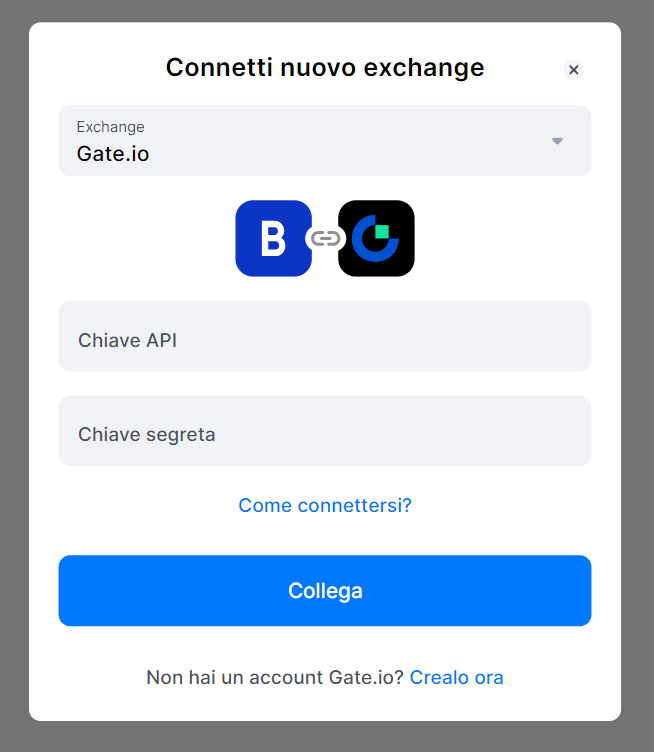 Dalla finestra pop-up, seleziona Gate. Si aprirà una finestra in cui potrai aggiungere la chiave API e la chiave segreta, quindi clicca su [Collega].