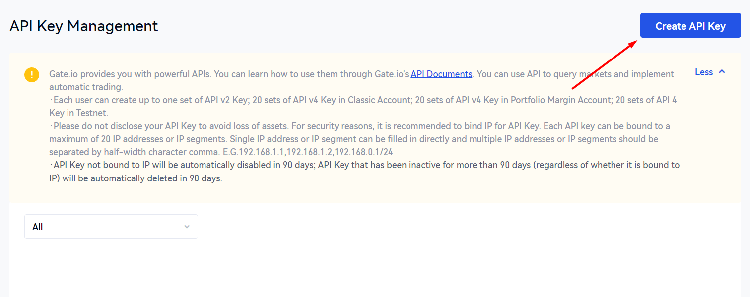 Clicca sul pulsante [Create API Key] (Crea chiave API) per creare una nuova chiave API.