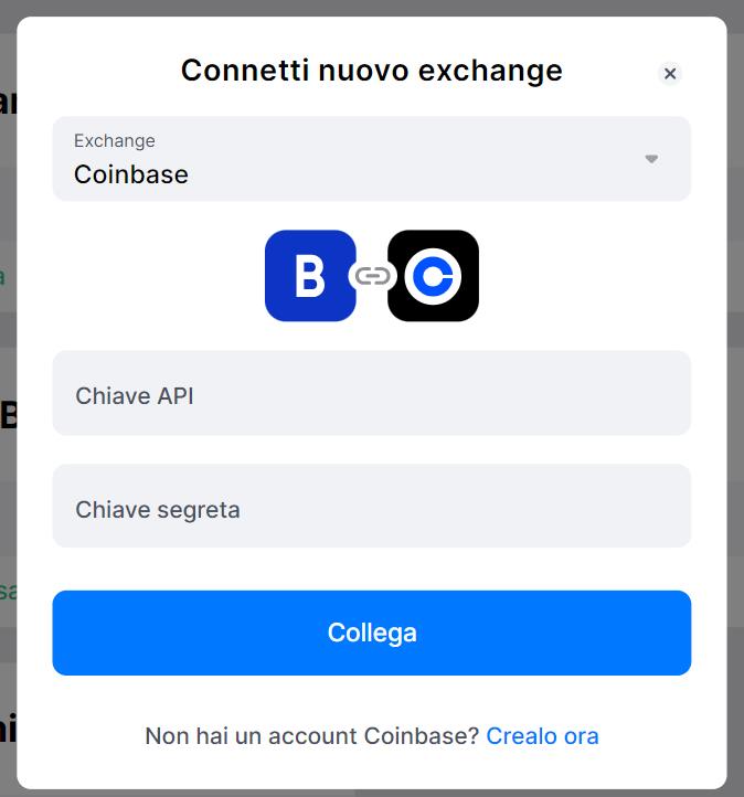 Per aggiungere le tue chiavi API per Coinbase Advanced Trade, cerca l’exchange nella finestra pop-up. Da quo verrai ricondotto alla finestra in cui puoi aggiungere le tue chiavi.