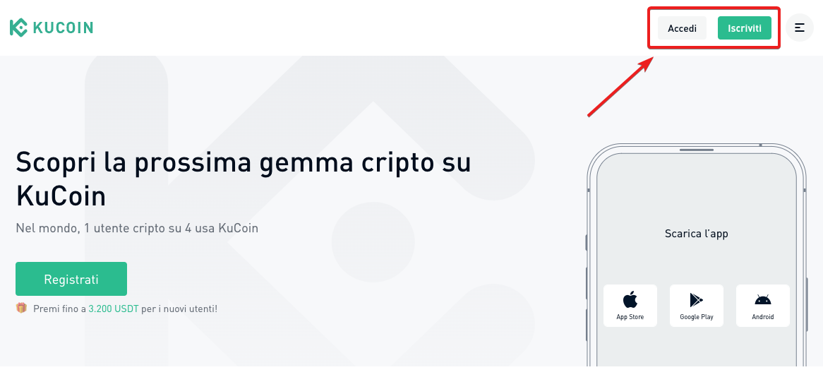 Accedi al tuo account Kucoin o registrati se sei un nuovo utente.
