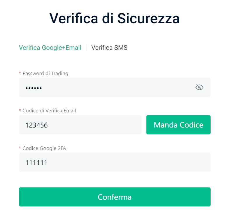 Inserisci la tua password di trading, il codice di verifica email e il codice 2FA, quindi clicca sul pulsante [Conferma].