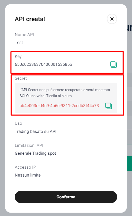 La tua chiave di trading Kucoin è stata creata con successo ed è pronta per essere collegata alla nostra piattaforma! Copia la tua chiave API e la tua chiave segreta in un posto sicuro prima di aggiungerle a Bitsgap.