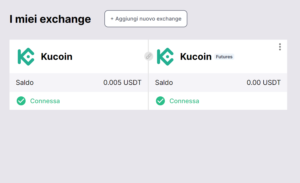Se tutto è stato eseguito correttamente, vedrai Kucoin aggiunto all'elenco dei tuoi exchange collegati con lo stato "Connessa" e il saldo di trading disponibile sul tuo conto.