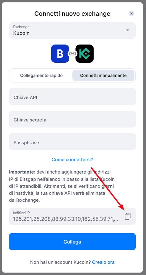 5. Seleziona Kucoin dall'elenco e copia gli indirizzi IP di Bitsgap