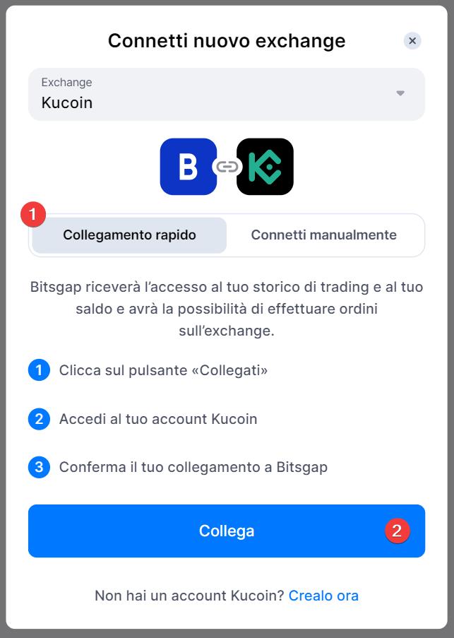 Seleziona Kucoin dall'elenco, scegli "Collegamento rapido" e poi clicca su [Collega].