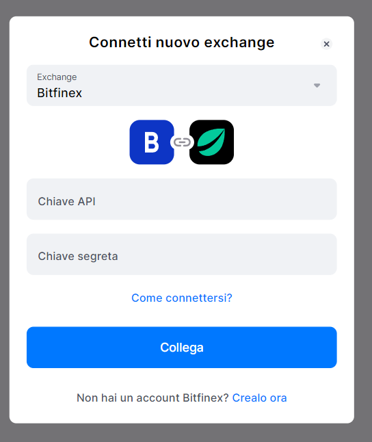 Dalla finestra pop-up, dovrai selezionare Bitfinex. Si aprirà una finestra in cui potrai aggiungere la chiave API e la chiave segreta. A questo punto clicca su [Collega].