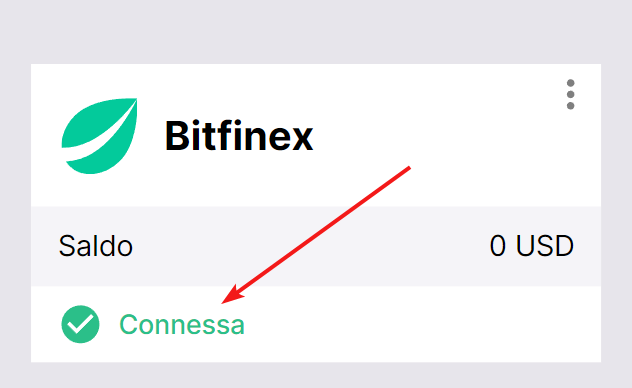 Se tutto è stato eseguito correttamente, vedrai Bitfinex aggiunto all'elenco dei tuoi exchange con lo stato Connessa e il saldo di trading sul tuo conto.