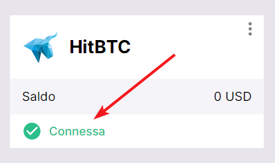 Se tutto è stato eseguito correttamente, vedrai HitBTC aggiunto all'elenco dei tuoi exchange collegati con lo stato Connessa e il saldo di trading disponibile sul tuo conto.