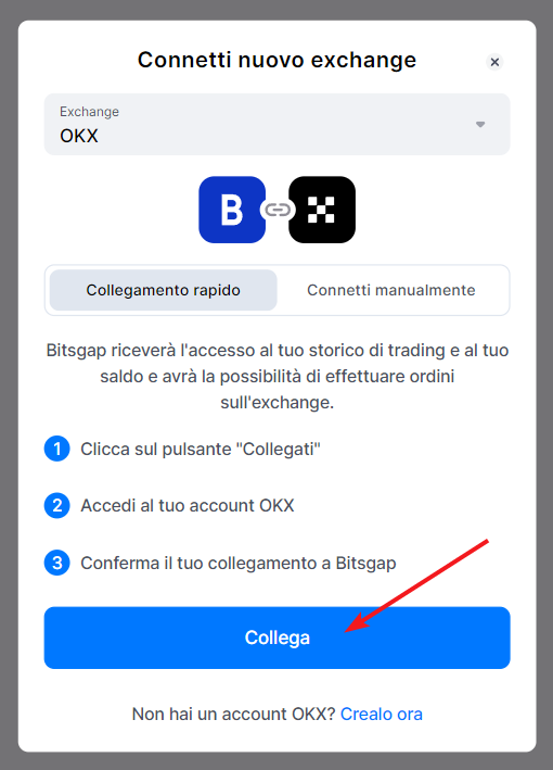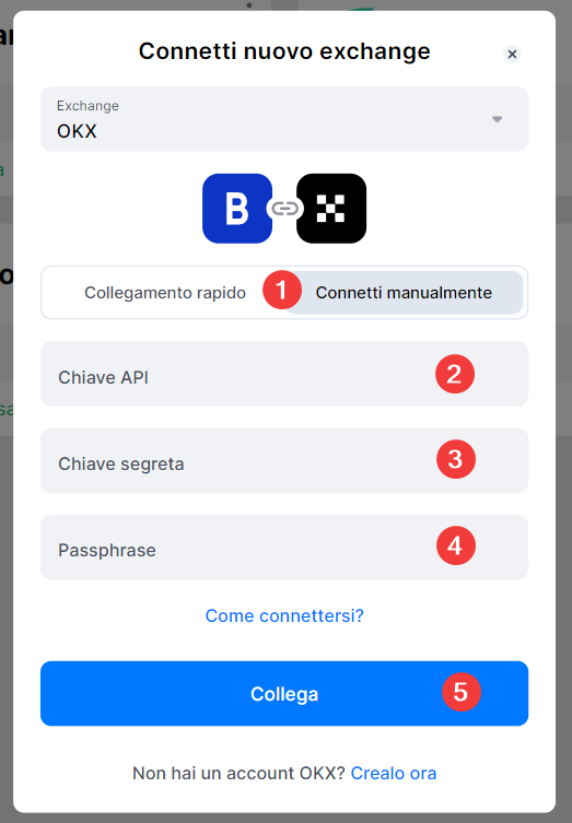 Dalla finestra pop-up, è necessario selezionare OKX. Nella finestra Connetti manualmente, puoi incollare la chiave API, la chiave segreta e la passphrase. Quindi clicca su [Collega].