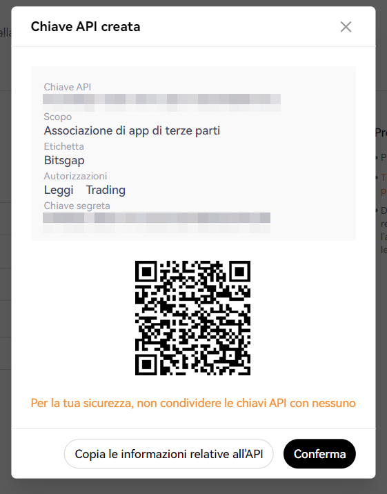Ora la tua chiave di trading OKX è stata creata con successo ed è pronta per essere connessa alla nostra piattaforma! Copia la tua API e le chiavi segrete in un posto sicuro prima di aggiungerle a Bitsgap.