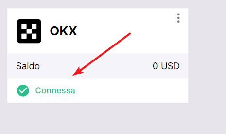 Se tutto è stato eseguito correttamente, vedrai OKX aggiunto all'elenco dei tuoi exchange collegati con lo stato Connessa e il saldo di trading disponibile sul tuo conto.