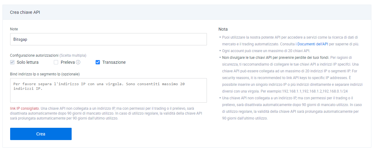 Dai alla tua chiave API un nome qualsiasi (a tua scelta), così potrai facilmente individuare che questa chiave è collegata al tuo account Bitsgap.