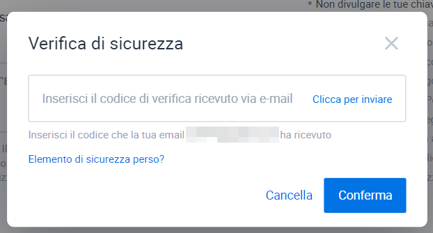 Riceverai un codice di verifica nella tua email, copia e incolla il codice. Al termine, clicca su [Conferma].