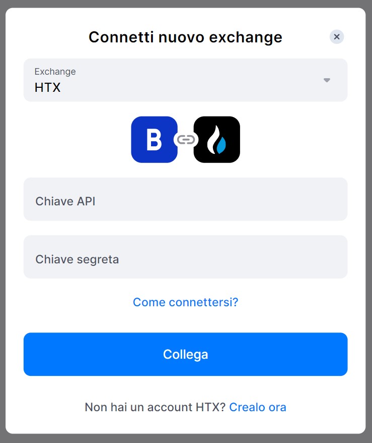 Dalla finestra pop-up, seleziona HTX. Si aprirà una finestra in cui potrai aggiungere la tua chiave API e la chiave segreta. A questo punto clicca su [Collega].