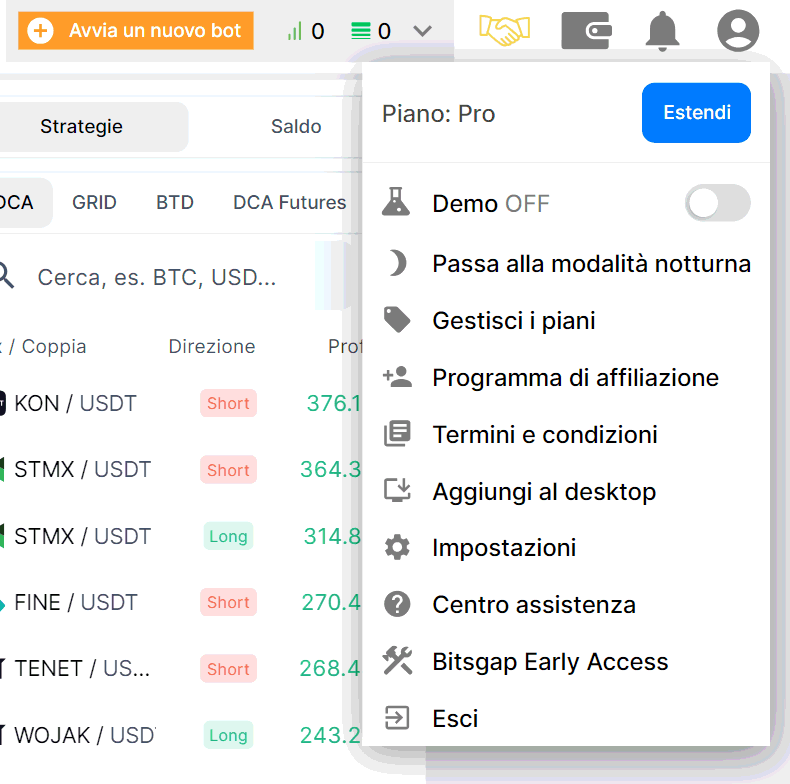 Accedi al tuo account Bitsgap e clicca sul pulsante del tuo profilo, a destra. Seleziona [Estendi] o [Aggiorna] accanto alle informazioni del tuo piano.