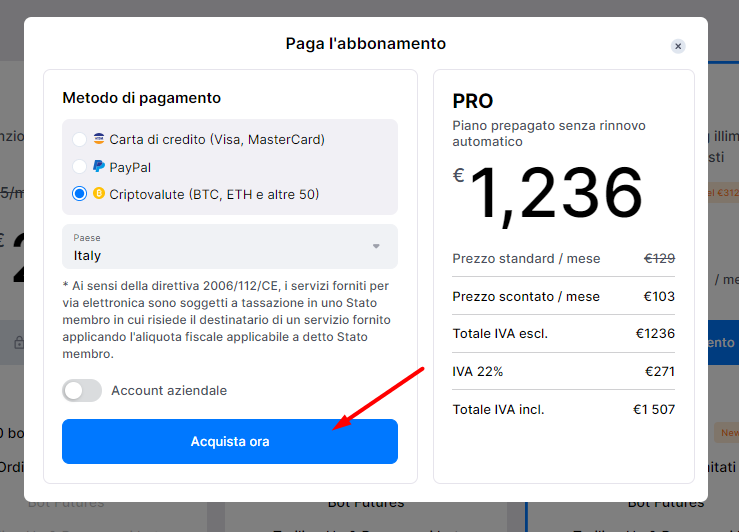 Seleziona la criptovaluta come metodo di pagamento. Una volta terminato, clicca su [Acquista ora].