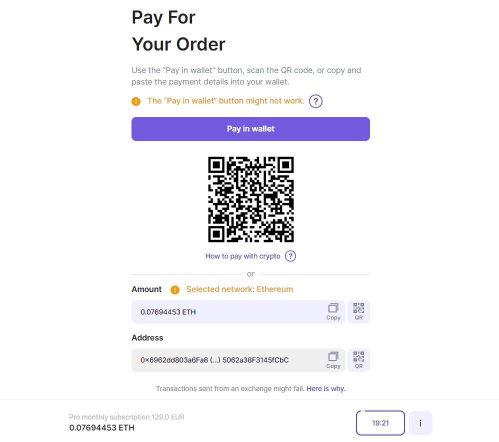 Il tasso rimane valido solo per 20 minuti. Durante questo periodo, l'importo specificato nella criptovaluta selezionata deve essere ricevuto all'indirizzo indicato. Il piano del tuo account verrà aggiornato entro 15-30 minuti dopo il pagamento andato a buon fine.