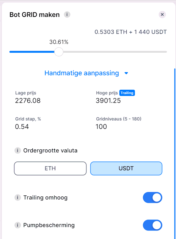 Let op: Wanneer je de prijzen aanpast, wordt standaard alleen het percentage van de gridstap gewijzigd. Het aantal niveaus blijft behouden. Als je daarna het gridstappercentage of het aantal niveaus bewerkt, blijft de laatst aangepaste waarde vaststaan en wordt de andere automatisch aangepast.