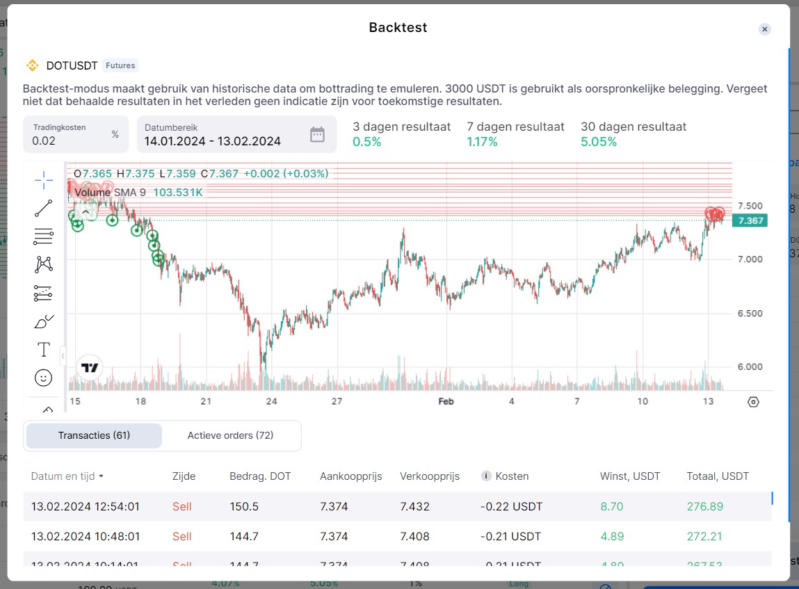 Voordat je de bot start, kun je met de functie Backtest nagaan hoe je instellingen zouden hebben gepresteerd op basis van historische gegevens.