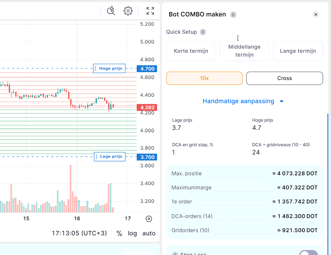 - DCA en Grid Step: De procentuele afstand tussen orders.