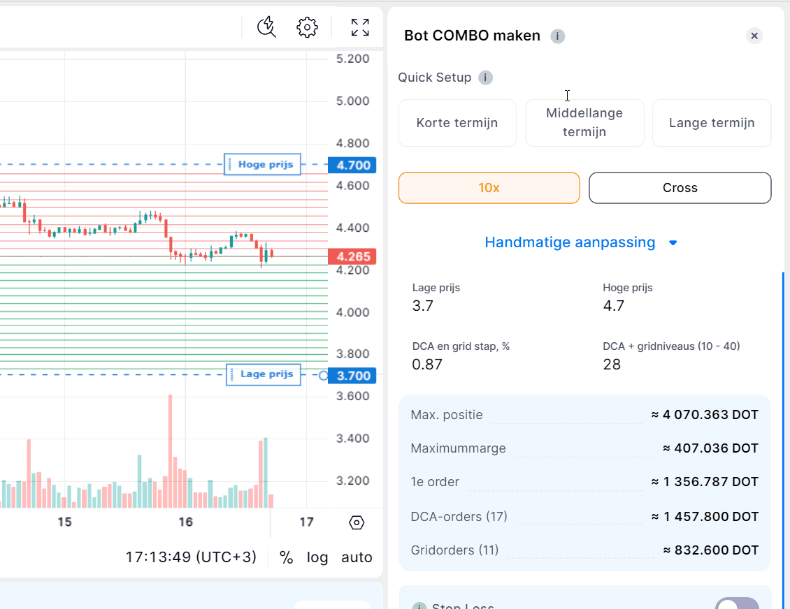 - Stop Loss: Stel een prijsniveau of Totale % PnL in waarbij de bot de positie zal sluiten om verliezen te beperken. Let op: de Stop Loss volgt standaard de prijs in gunstige richting en past zich aan de marktbeweging aan.