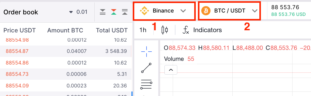 - Selecteer in het "Trading"-gedeelte de exchange en het handelspaar waarop u de slimme order wilt instellen.
