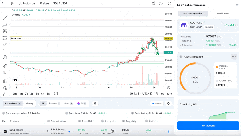 Zodra je GRID-bot actief is, kun je de prestaties volgen via het Prestatievenster en het tabblad Bot Orders.