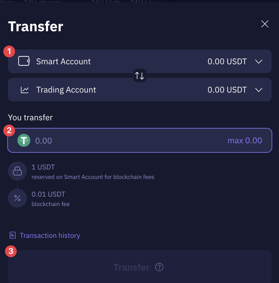 - Kies Smart Account als bron en Trading Account als bestemming.