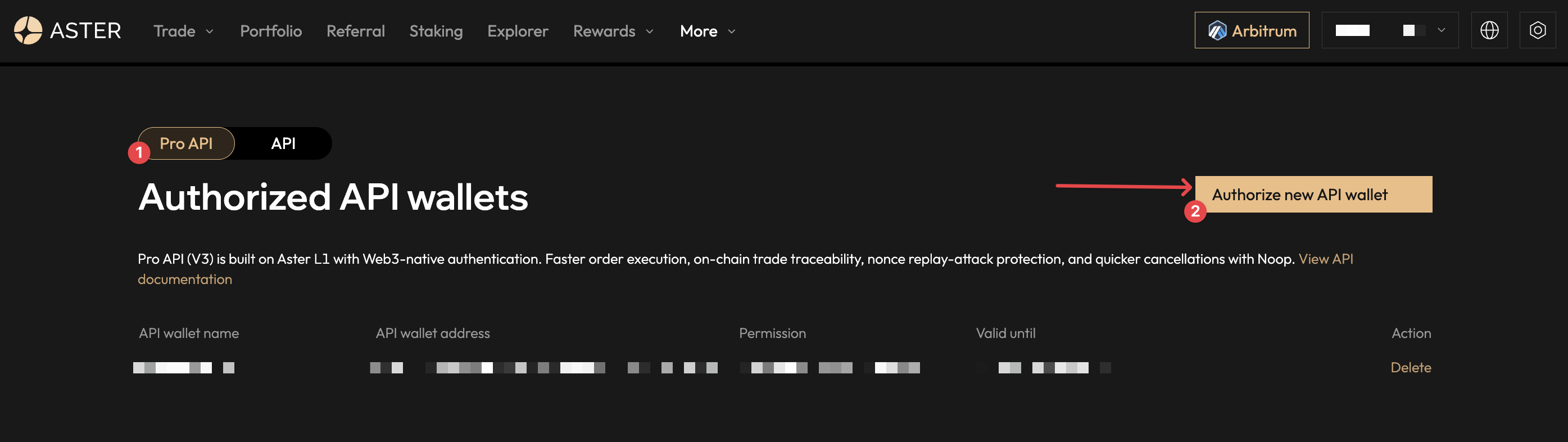 Ga naar het tabblad Pro API en klik op Authorize new API wallet om een V3 API-sleutel aan te maken.