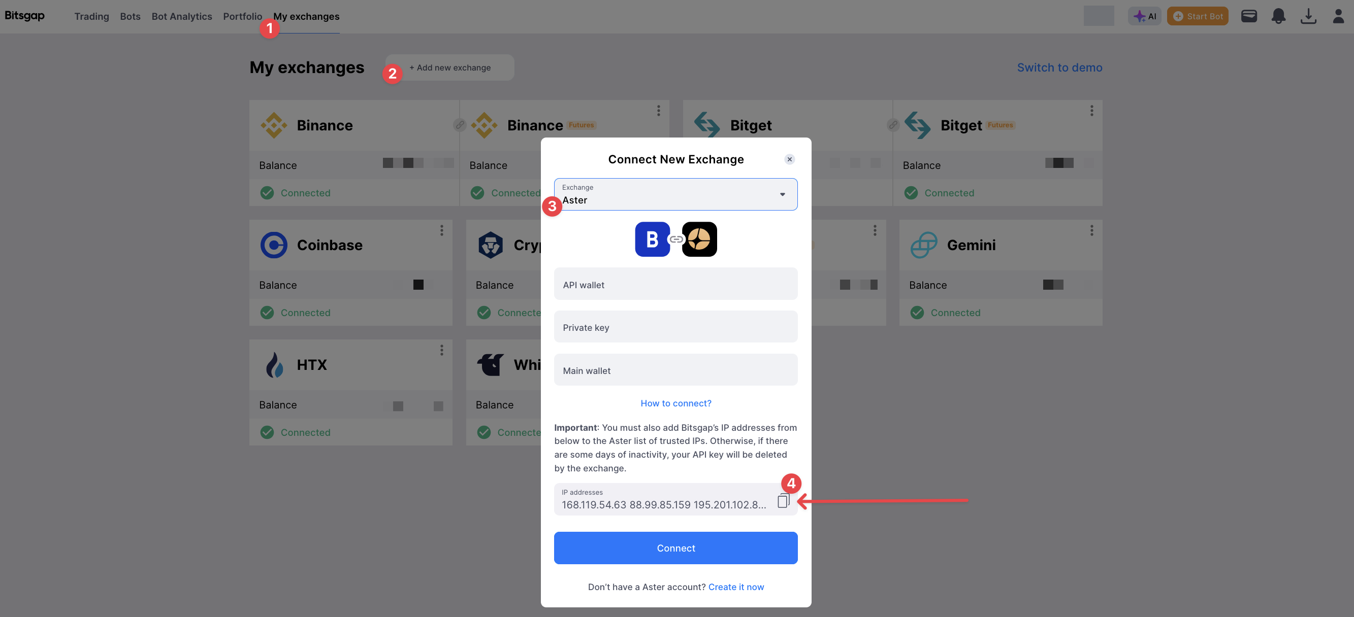 Nadat je je API-sleutel hebt aangemaakt, volg je de onderstaande stappen om je Aster-account met Bitsgap te verbinden.