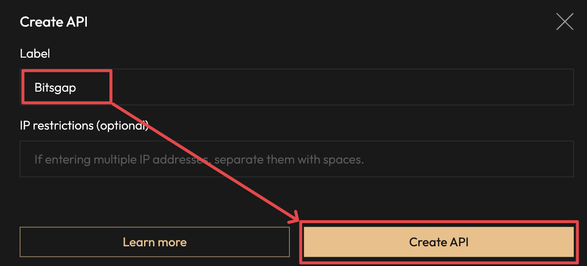 Geef een label aan je nieuwe API-sleutel (bijvoorbeeld “Bitsgap”).