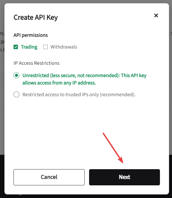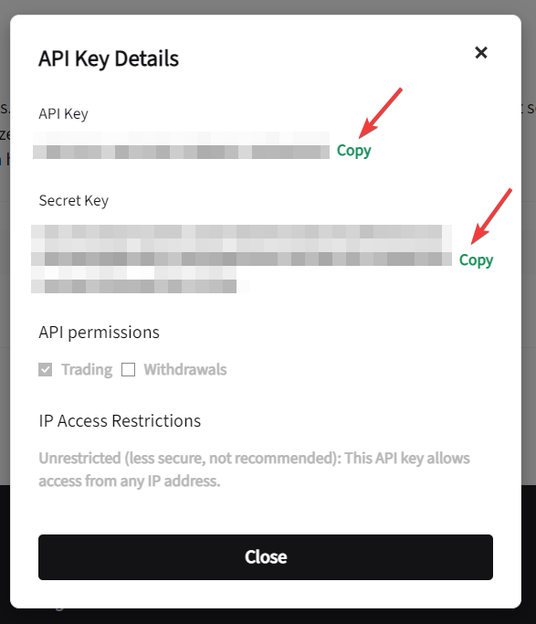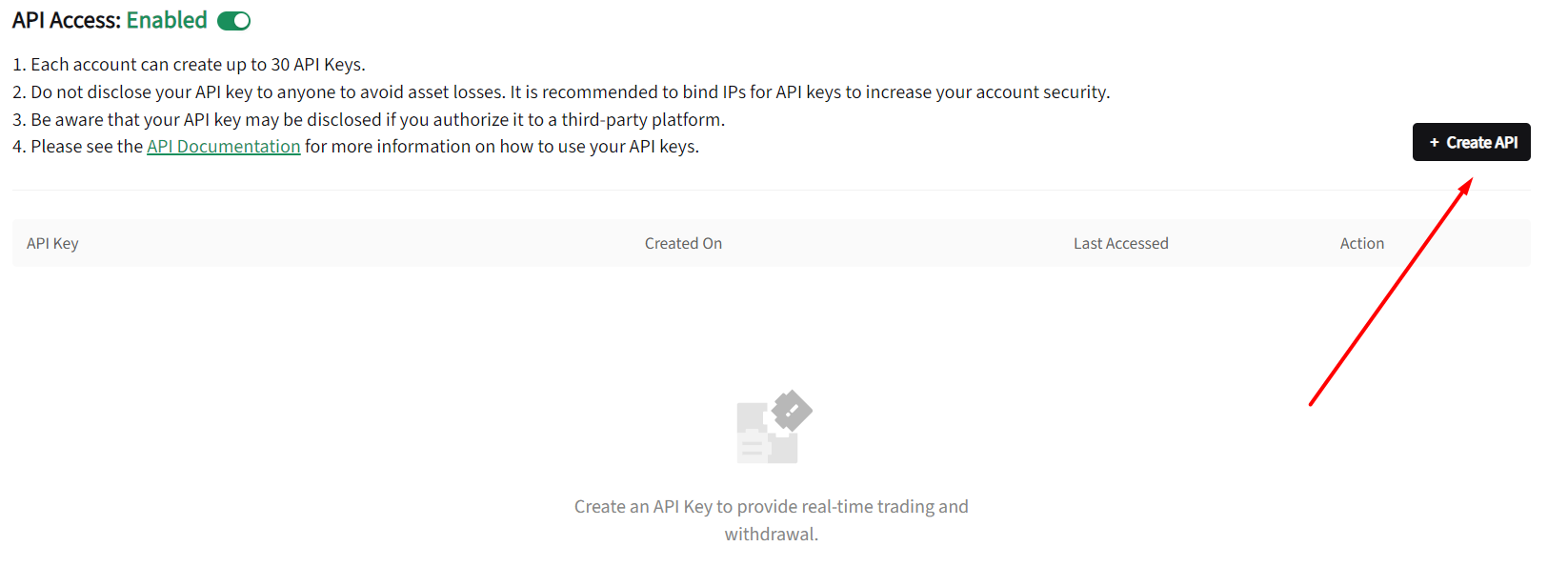 Alle handelstransacties worden gecreëerd en verwerkt met behulp van een exchange API key die uniek is voor elke gebruiker. Een API key is een veilige en betrouwbare manier om een platform te gebruiken, aangezien het platform zo geen toegang geeft tot je persoonlijke gegevens en er geen sprake is van fondsenbeheer (opnames & stortingen).
