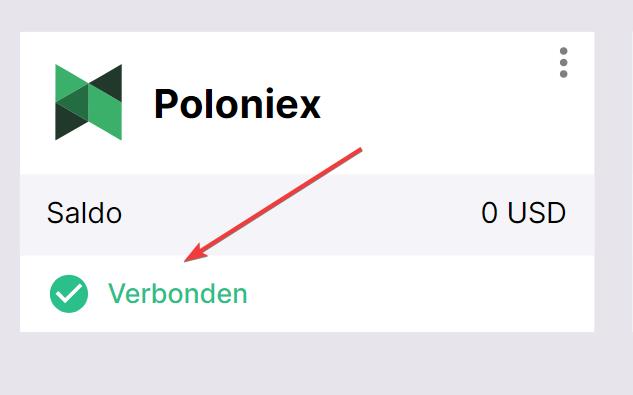 Als alles correct is gedaan, zie je dat Poloniex is toegevoegd aan de lijst van je aangesloten beurzen, met de Verbonden status en het handelssaldo beschikbaar op je rekening.